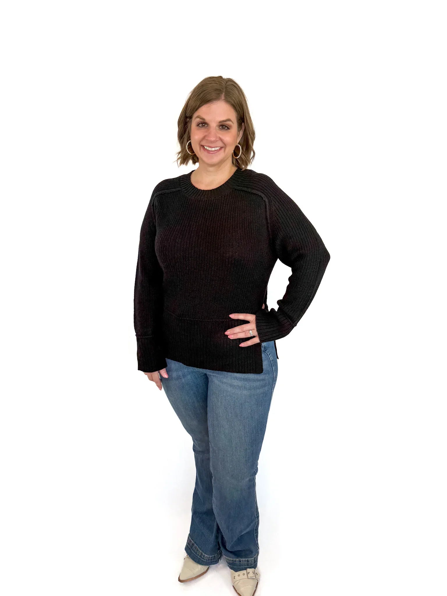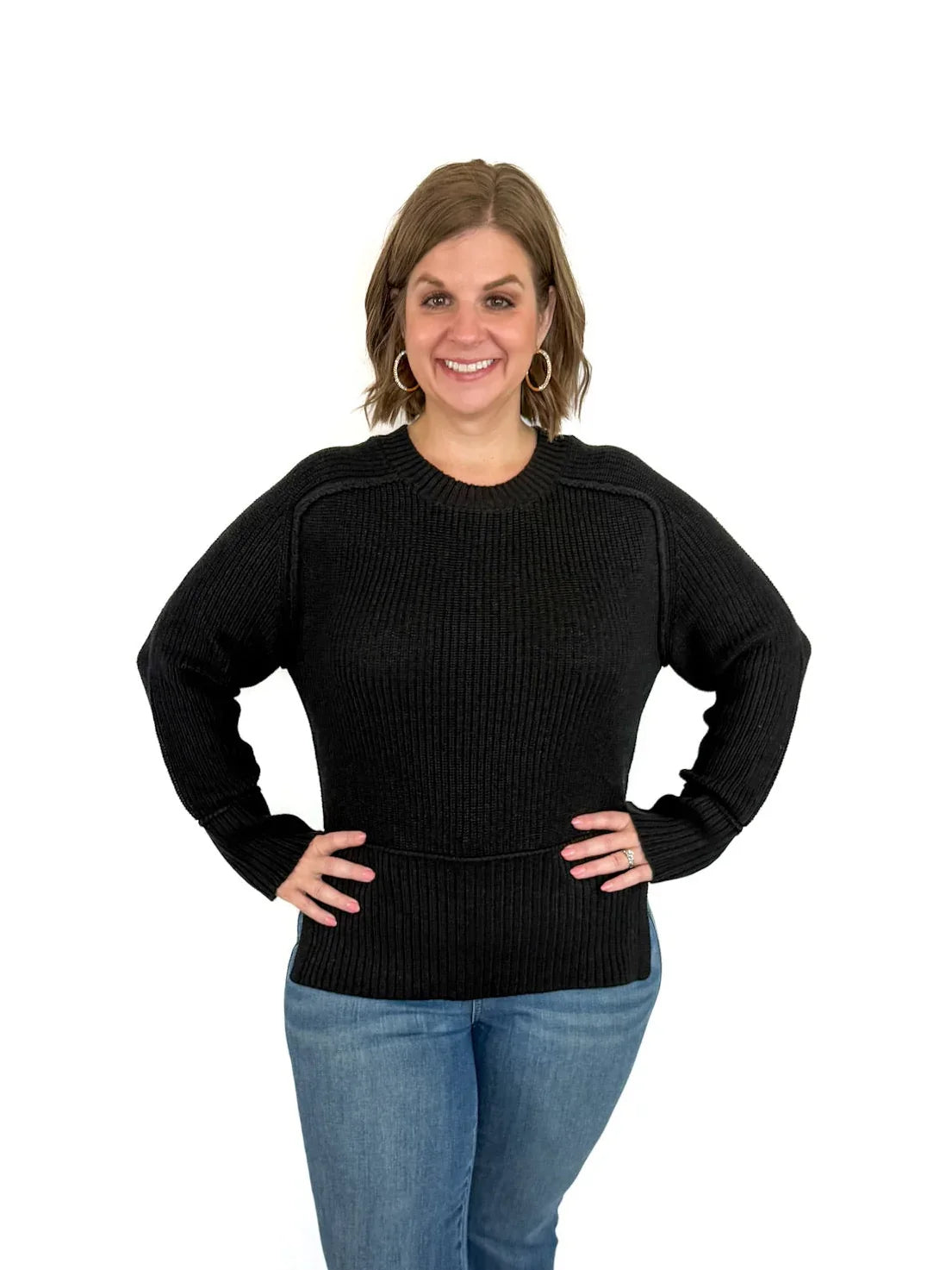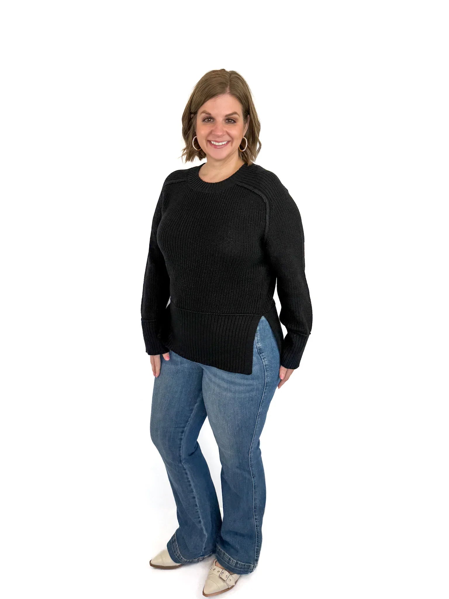 Say hello to the sweater that does it all! This black ribbed sweater combines a fitted silhouette with unexpected side slits that add personality without sacrificing comfort. Whether you're pairing it with sneakers or with heels, it effortlessly transitions from casual to dressy. Comfortable enough for everyday wear yet stylish enough to make a statement, it's cozy, chic, and endlessly wearable.