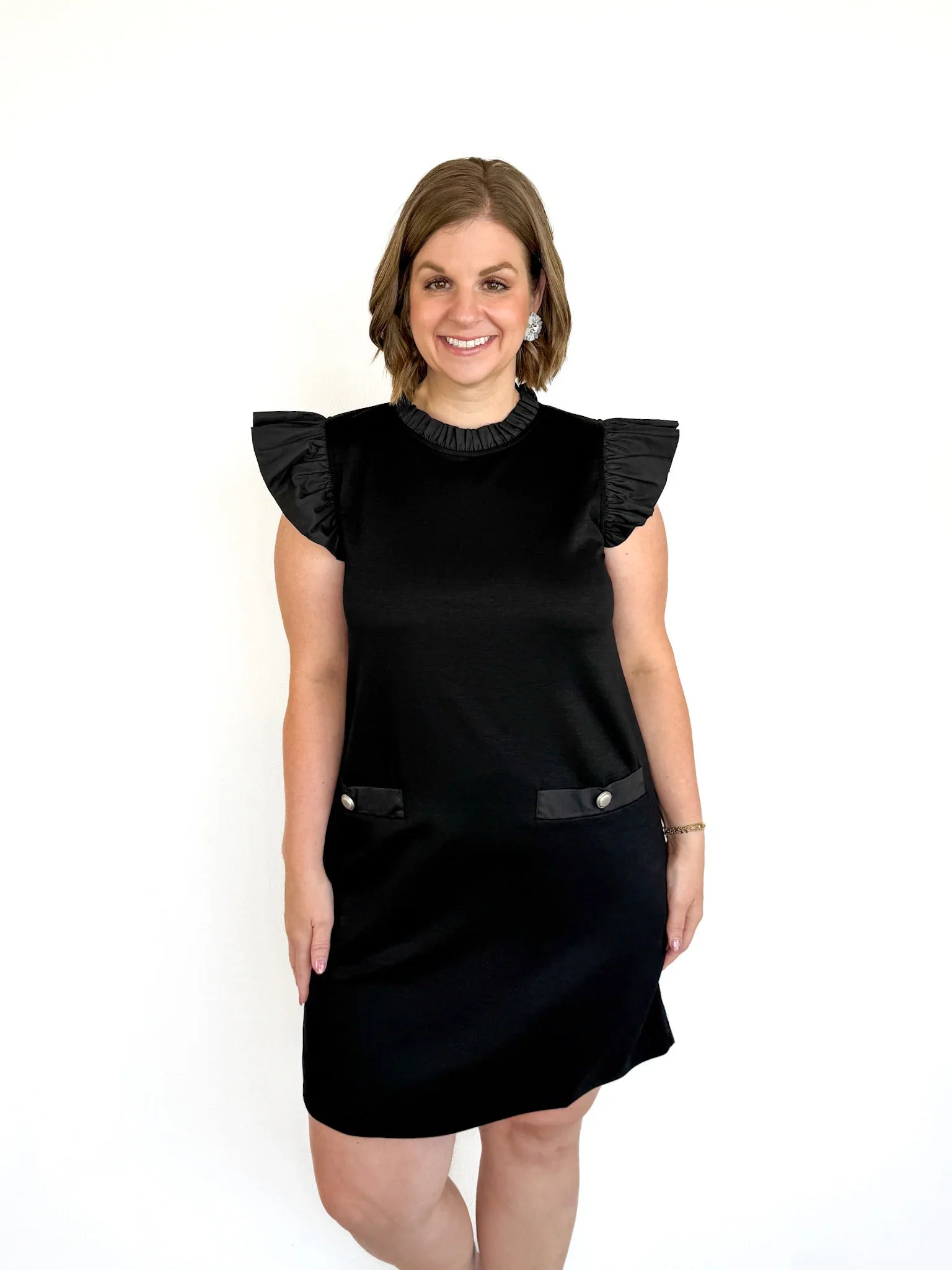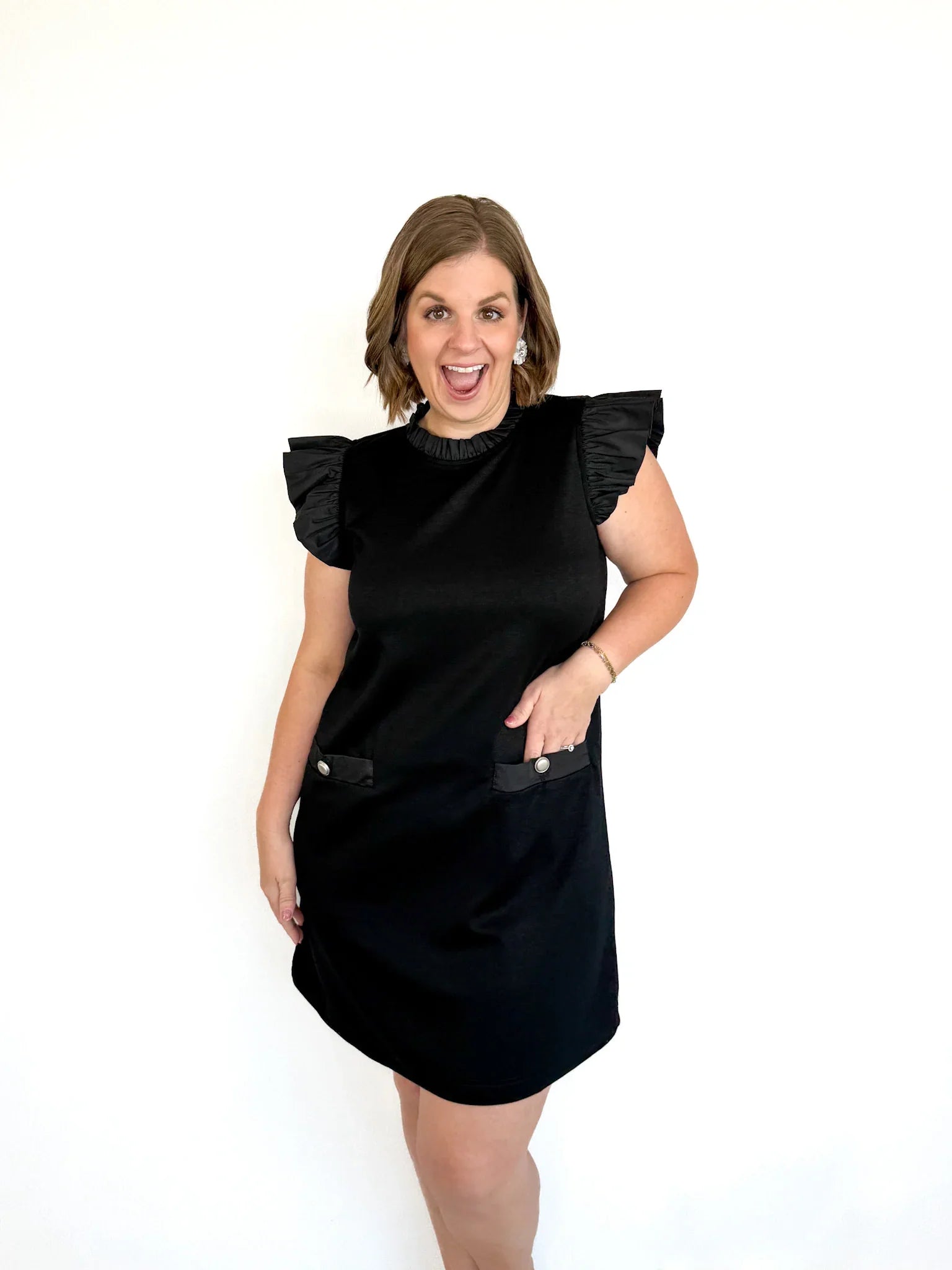 Discover elegance with a flirty edge in this Black Ruffled Cap Sleeve Shift Dress. Its sleek silhouette is enhanced by delicate ruffled cap sleeves, perfectly blending timeless sophistication with a touch of fun. Ideal for both day and evening occasions, this dress offers effortless style and a flattering fit that moves with you. Elevate your wardrobe with a piece that captures charm and confidence in every detail.