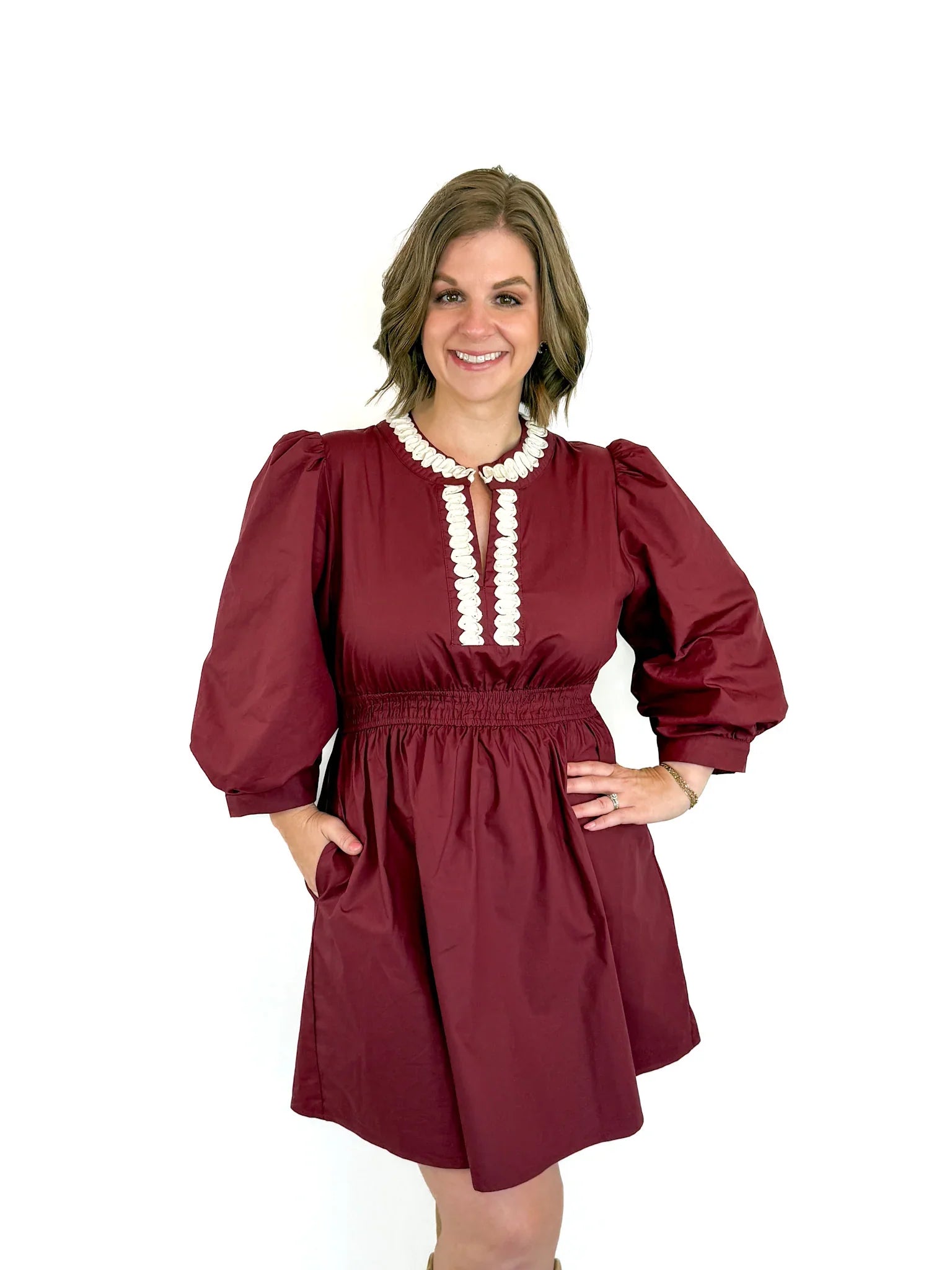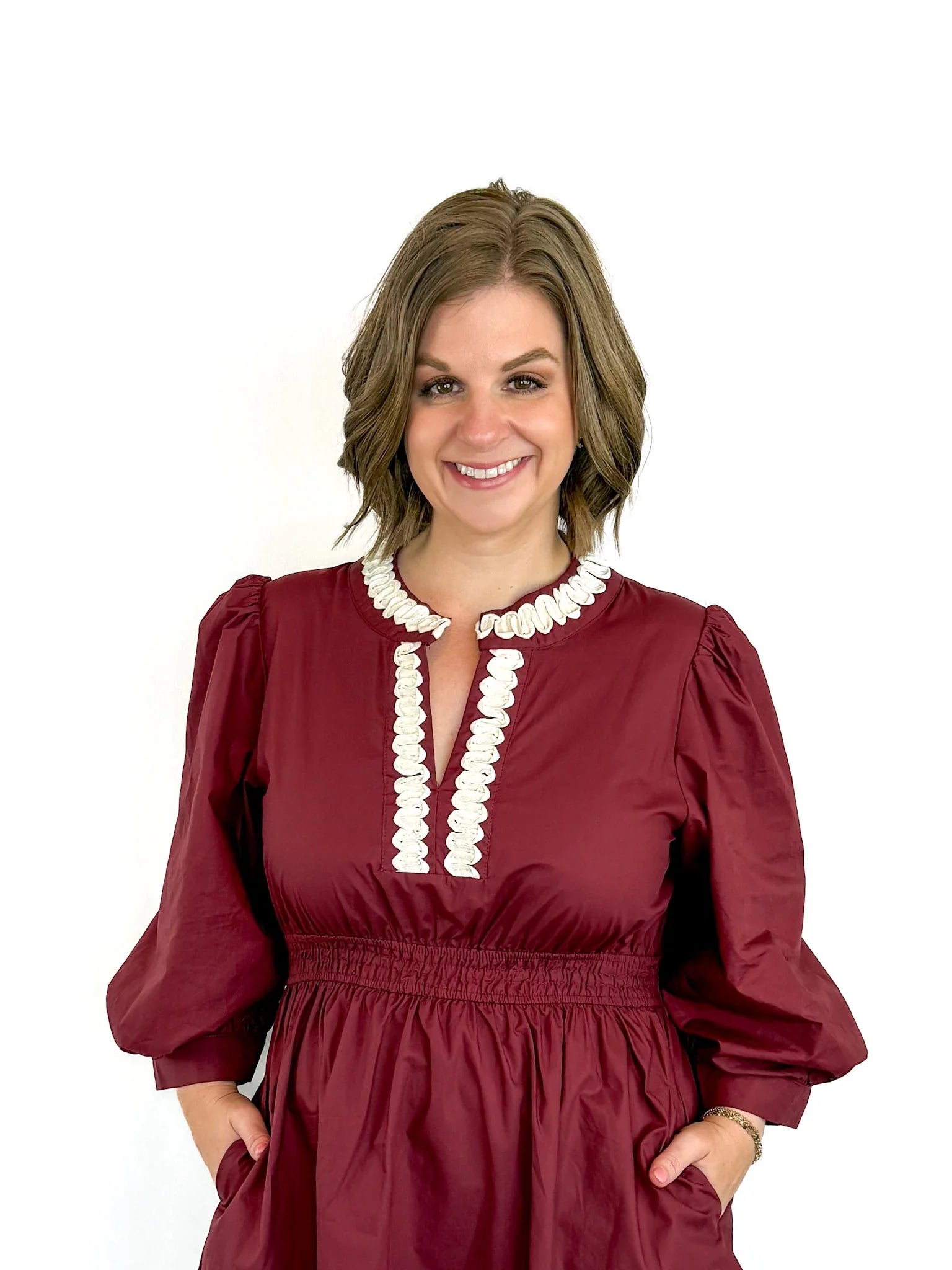 Elevate your wardrobe with this Burgundy Smocked Waist Dress, designed to flatter every figure with its comfortable smocked waist that cinches gently for a perfect fit. The rich burgundy hue adds timeless elegance, while delicate trim details create subtle, stylish accents. Ideal for both casual outings and special occasions, this dress combines comfort and sophistication effortlessly.
