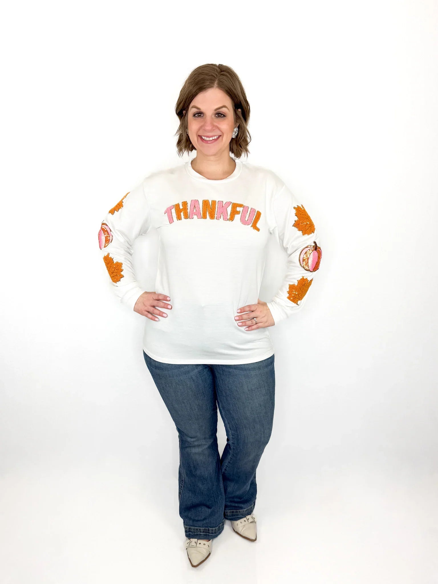 Celebrate the cozy spirit of fall with the Thankful Patch Long Sleeve Top, featuring leaf and pumpkin patches that trail down the sleeves. This delightful top brings a burst of autumn cheer to your wardrobe, making Thanksgiving gatherings feel even more special. Crafted for comfort and style, it’s perfect for savoring crisp days, pumpkin spice moments, and all the little joys of the season. Add a touch of festive fun to your outfit and let the season’s gratitude shine through in every wear.