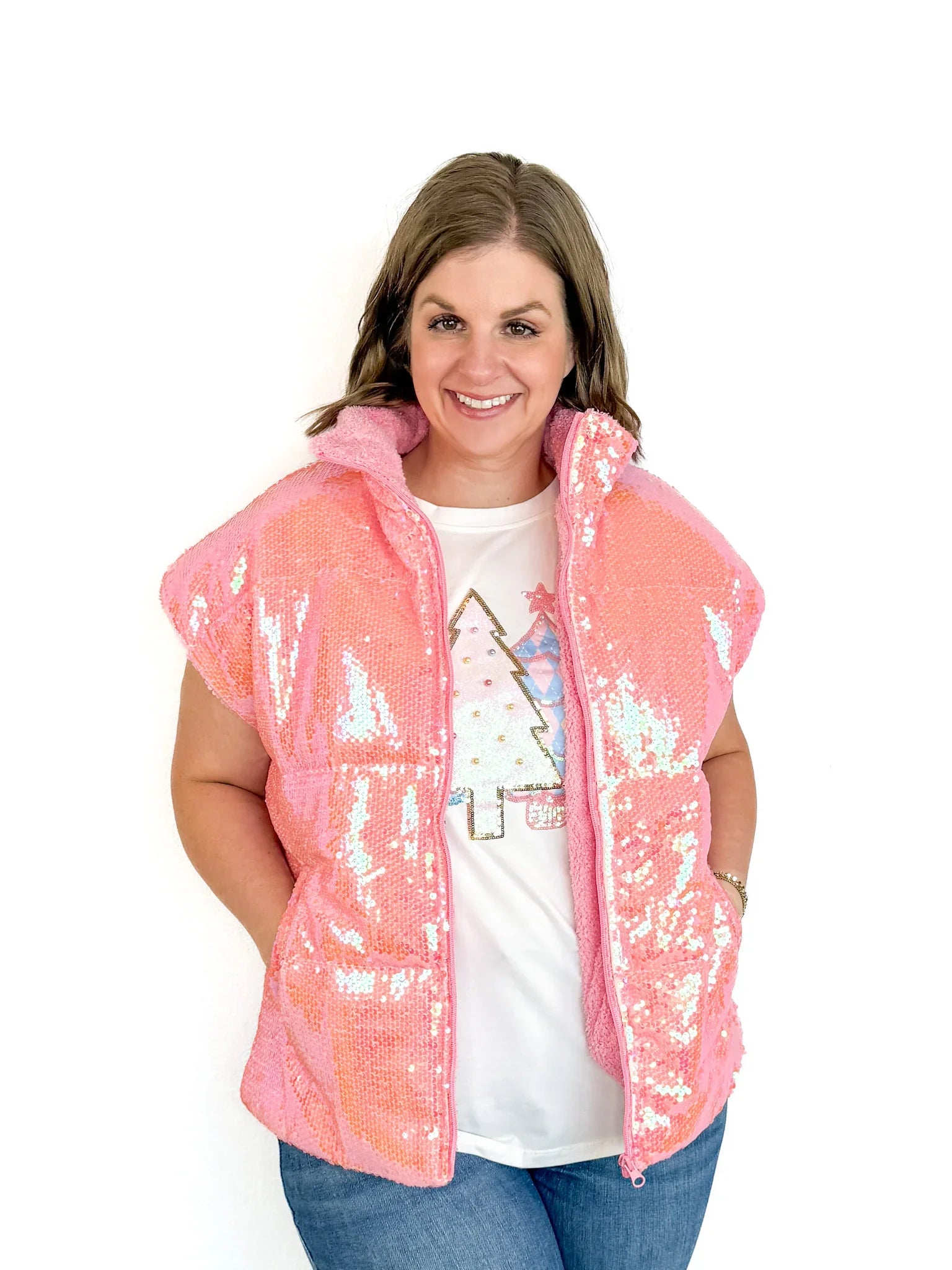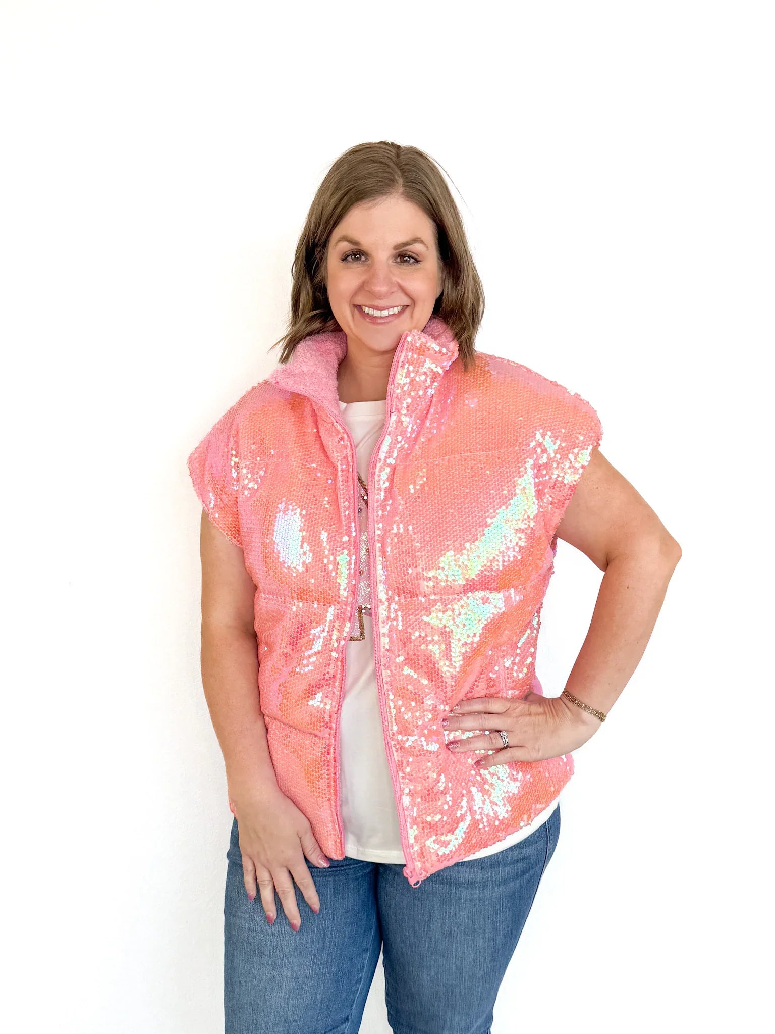 Elevate your style with the Pink Sequin Puffer Vest, a dazzling combination of comfort and glamour. This vest offers lightweight warmth and a shimmering sequin finish that brightens any look. Perfect for layering, it adds a playful yet chic touch to your wardrobe for the holidays or year round!