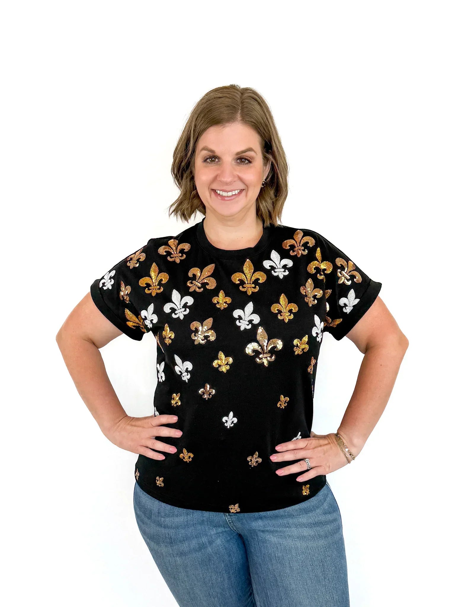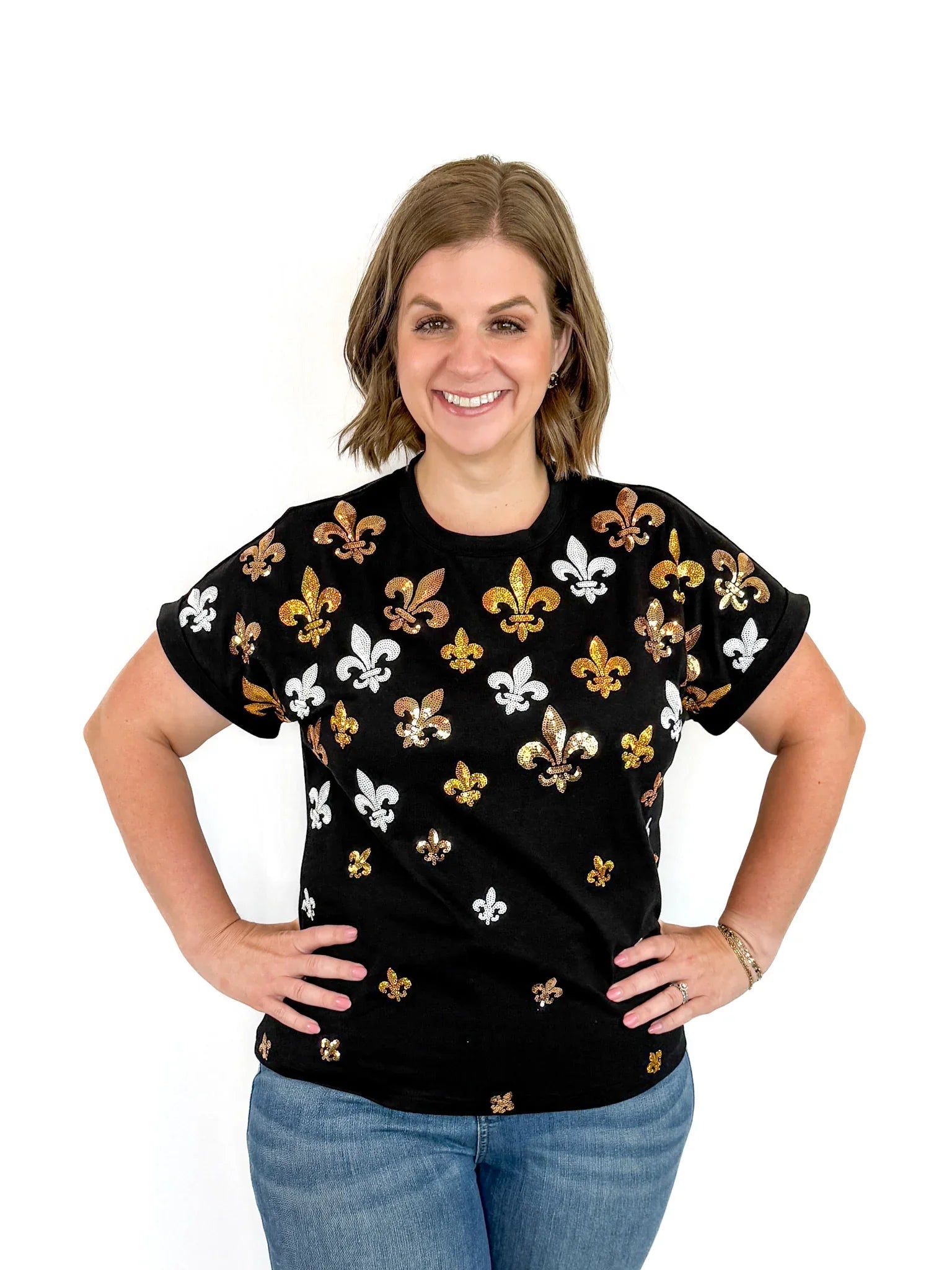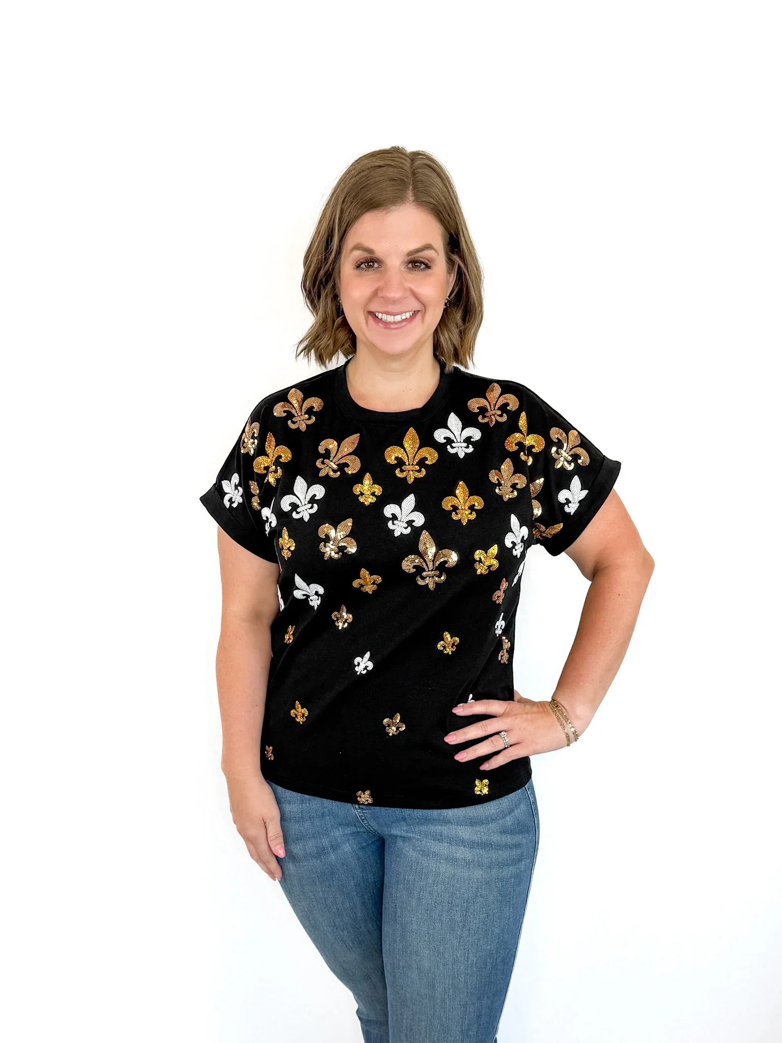 Get game day ready with this festive black top, featuring sequin fleur de lis scattered across the front for a subtle sparkle. Short, cuffed sleeves keep it cool and casual, making it the perfect choice to cheer on your team in style. Whether you're tailgating, watching from the stands, or celebrating with friends, this top blends laid back chic with just the right amount of shine to keep your look fun and festive all day long.