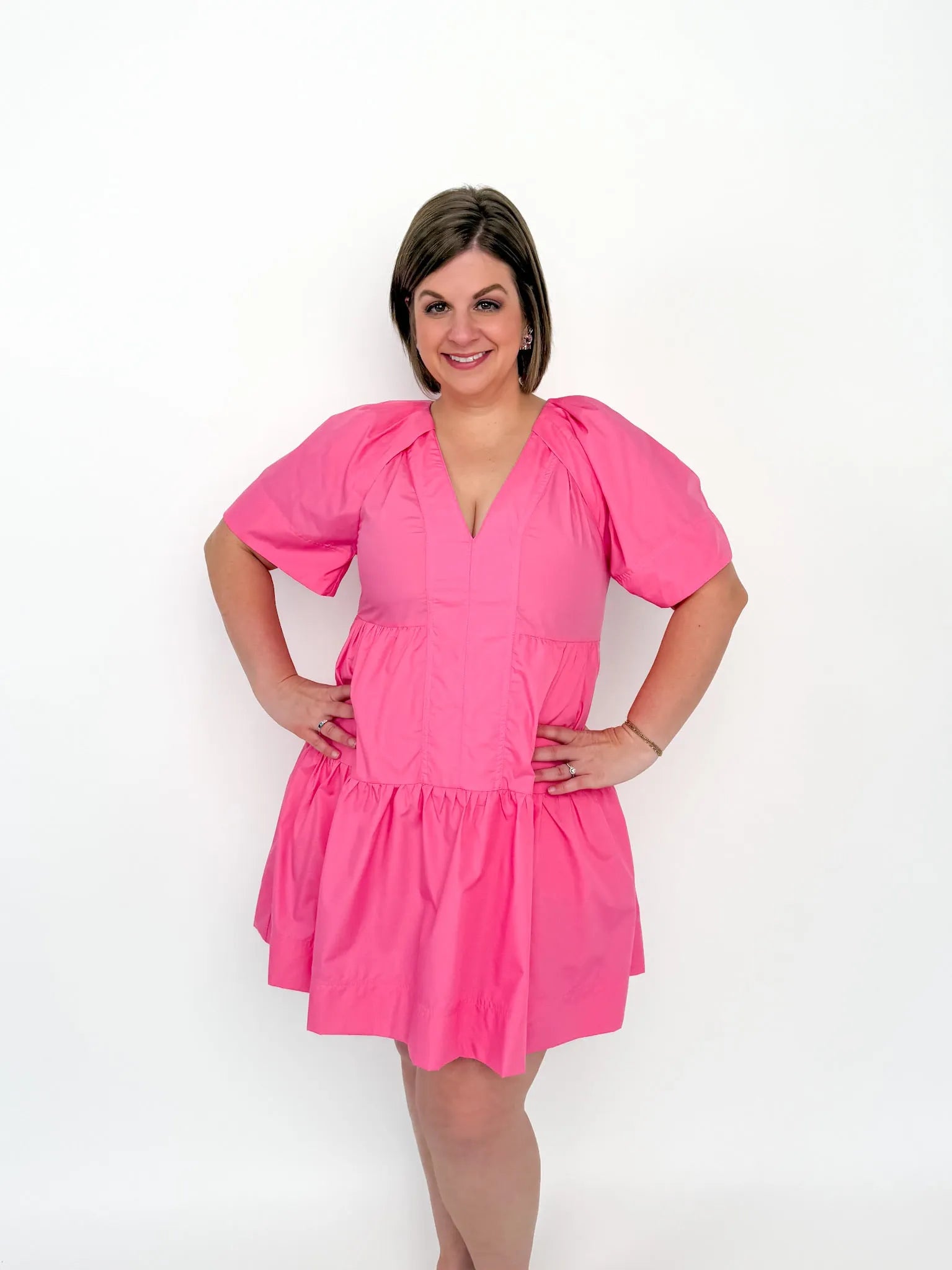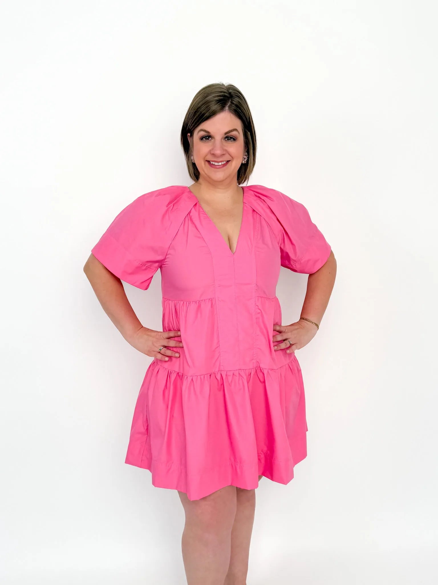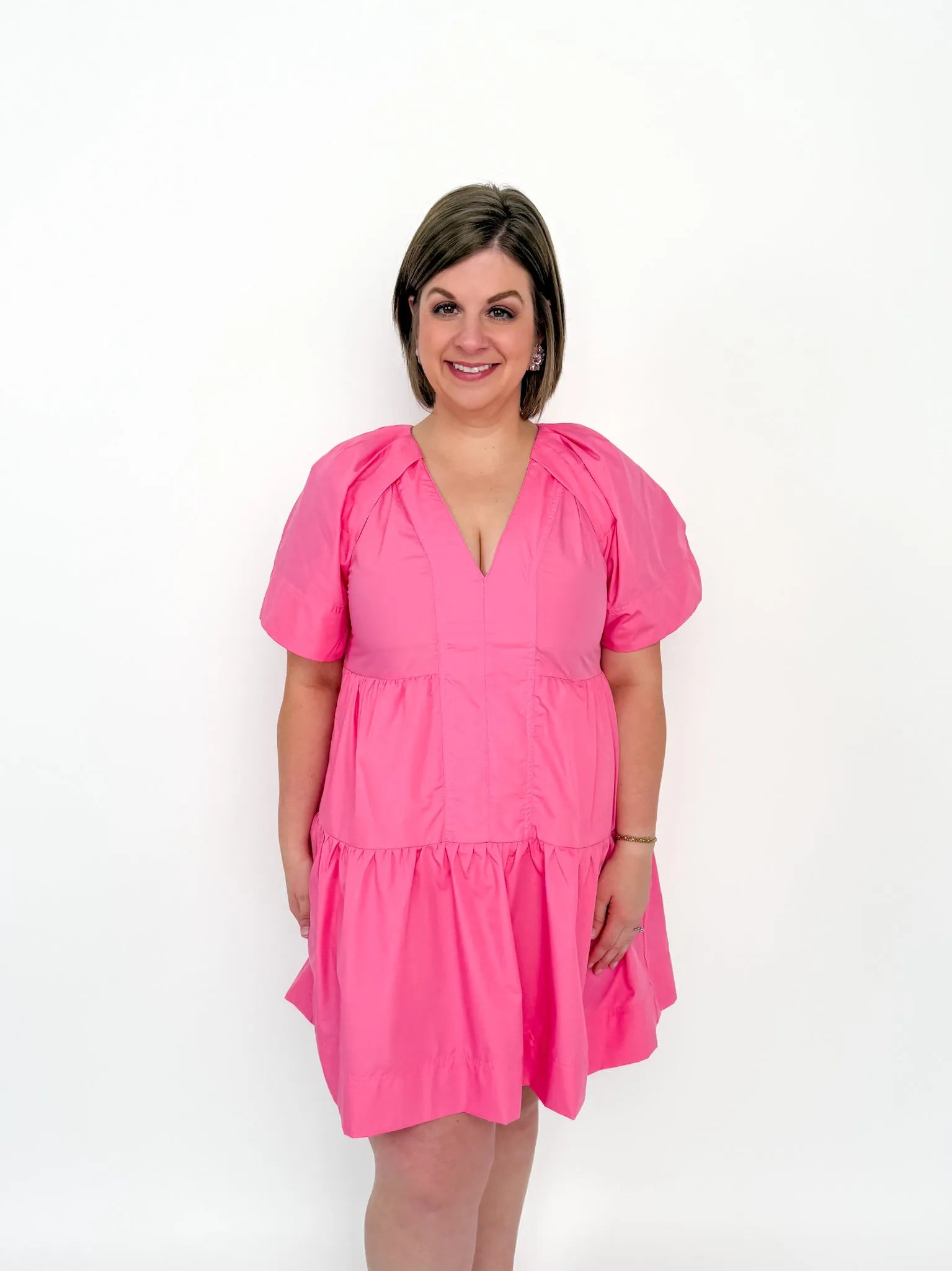 Be the life of the party with this flowy pink tiered dress! Its v-neck and pleated sleeves provide a flirty touch, perfect for any occasion. Say goodbye to boring dresses and hello to fun and playful fashion.