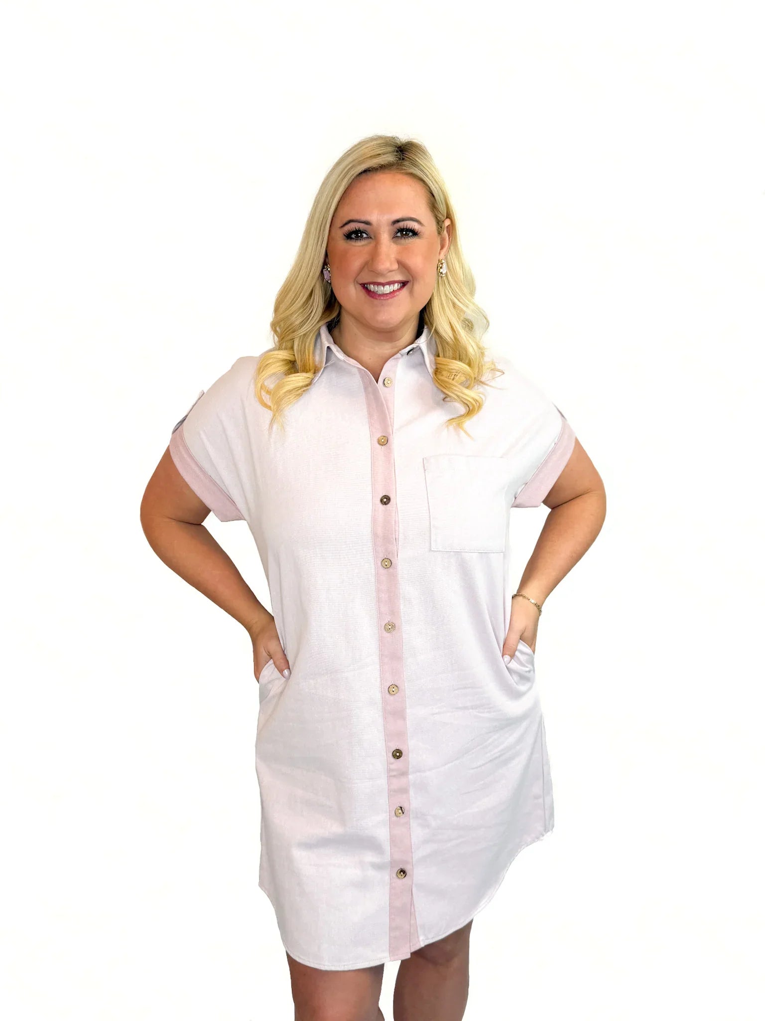 This light pink drop shoulder shirt dress is the ultimate woven essential for effortless weekend style and spontaneous road trips. Combining a relaxed button-front silhouette with chic contrasting trim and functional side pockets, it’s the versatile upgrade your casual wardrobe deserves.