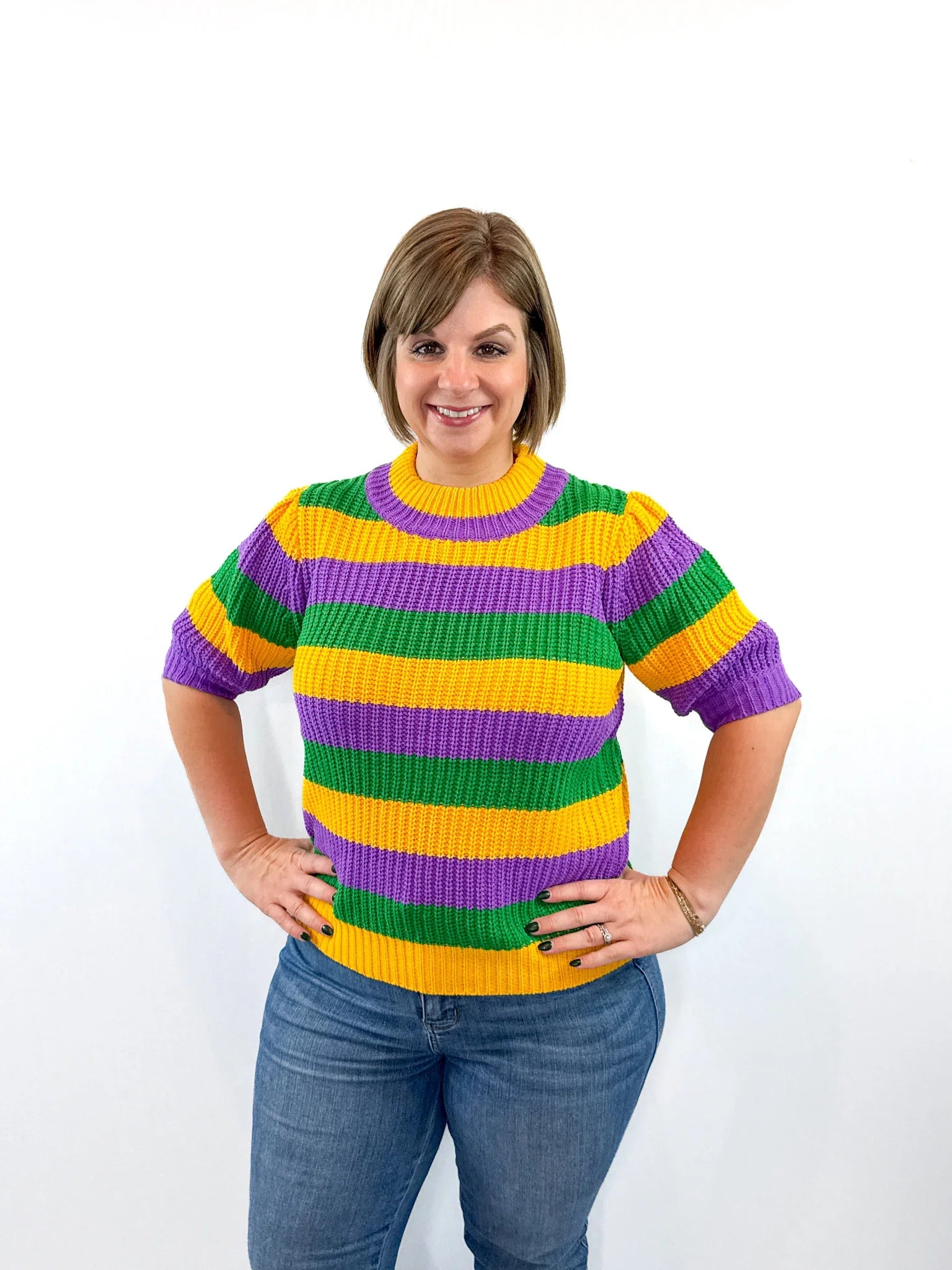 Celebrate in style with this festive Mardi Gras Striped Hacci Knit Top, featuring bold purple, green, and gold stripes that pop with personality. The soft, stretchy Hacci knit fabric keeps you comfortable all day long, while the charming puff sleeves add a playful touch that's perfect for parties, parades, or just spreading good vibes. Whether you're hitting the streets or heading to a gathering, this vibrant top brings the fun and flair of the season wherever you go.