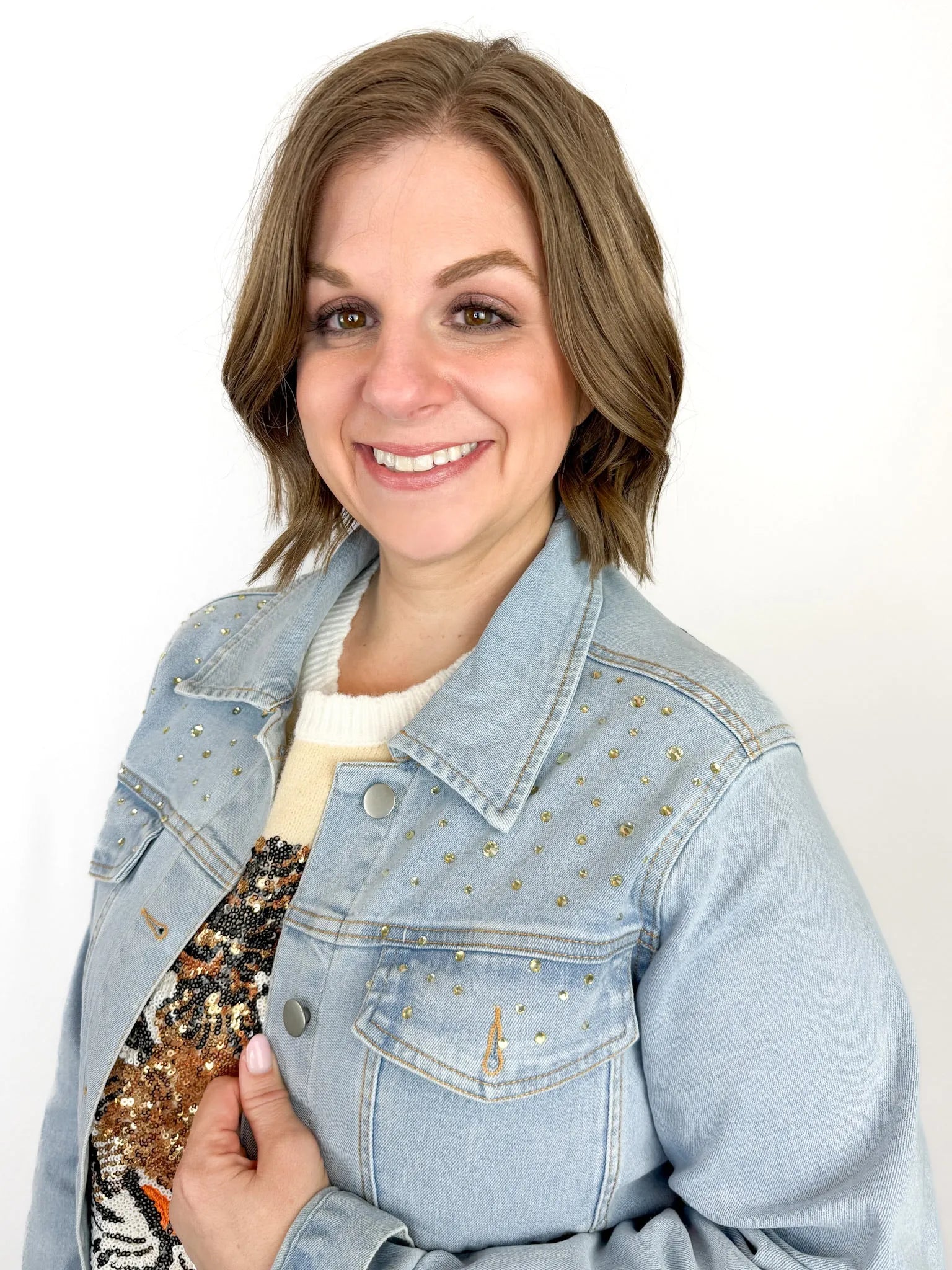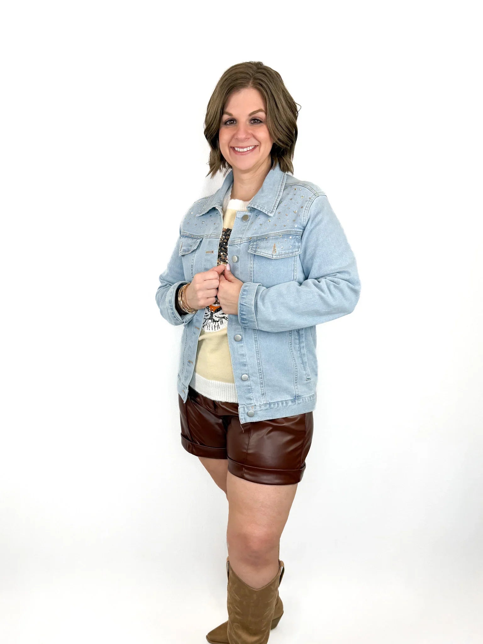 Get ready to roar with style on game day! This stretchy denim jacket dazzles with gold rhinestones on the front and a striking sequin tiger face on the back. Comfortable and eye-catching, it’s perfect for showing off your team spirit in a fun, playful way.