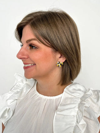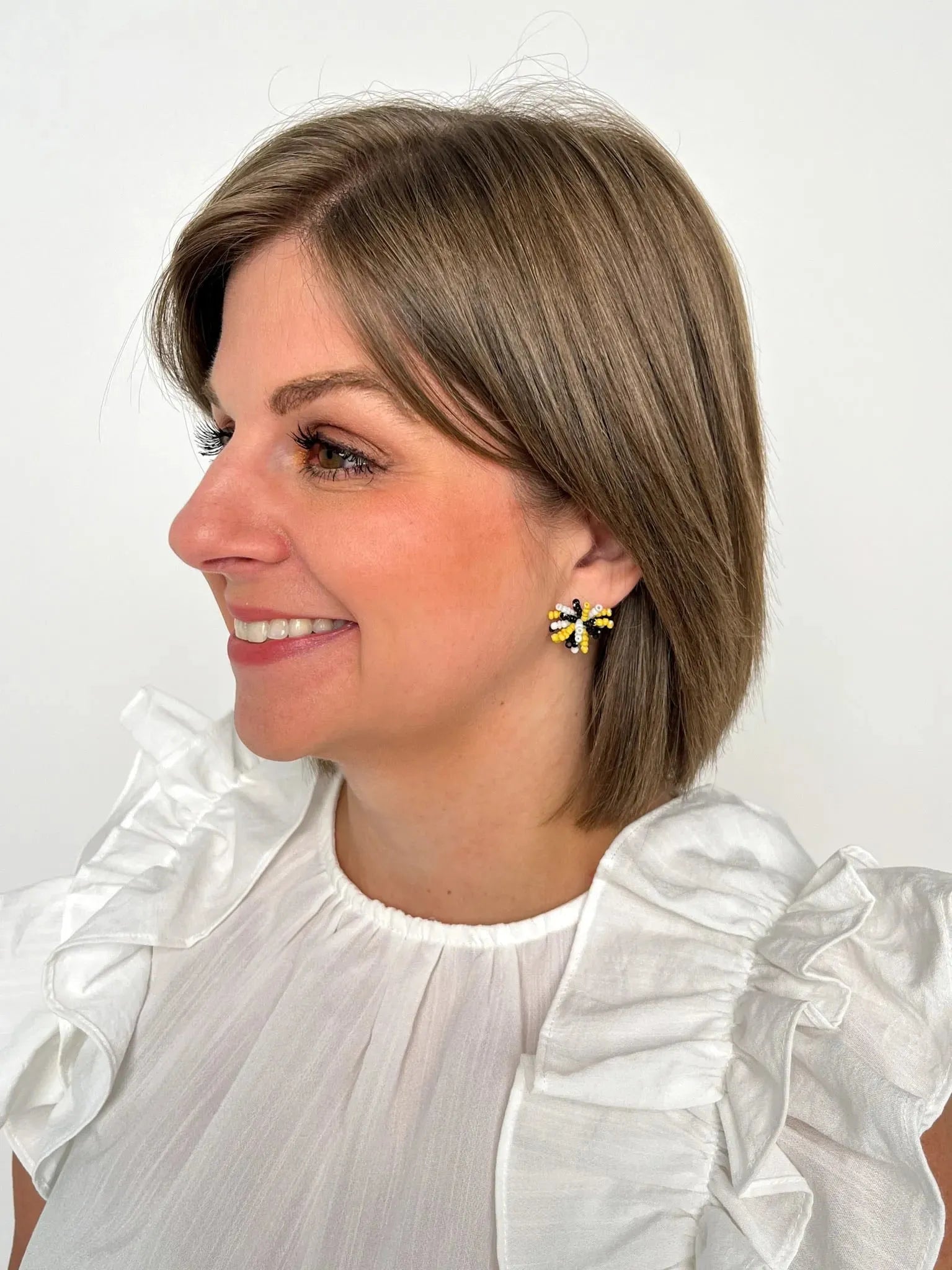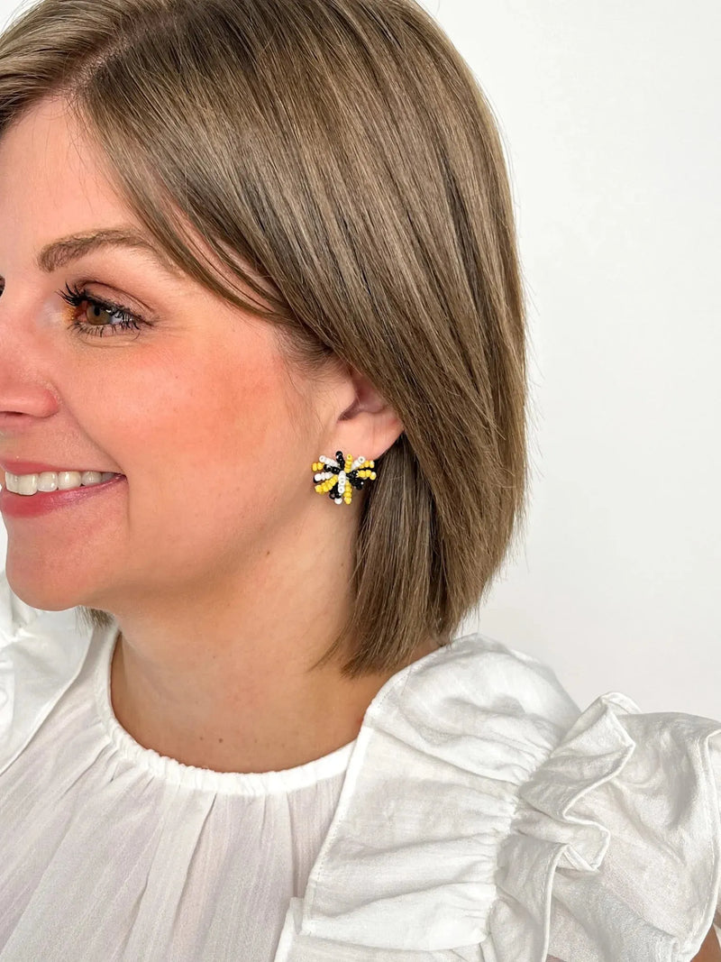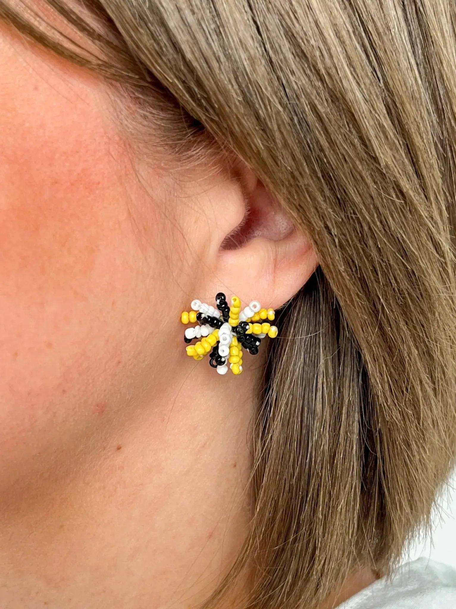 Add a playful touch to any outfit with our Black & Gold Pom Pom Studs! These unique studs feature a fun combination of black, gold, and white beaded pom poms, making them the perfect accessory for game day or any day. These fun and stylish earrings are even perfect for the littles!