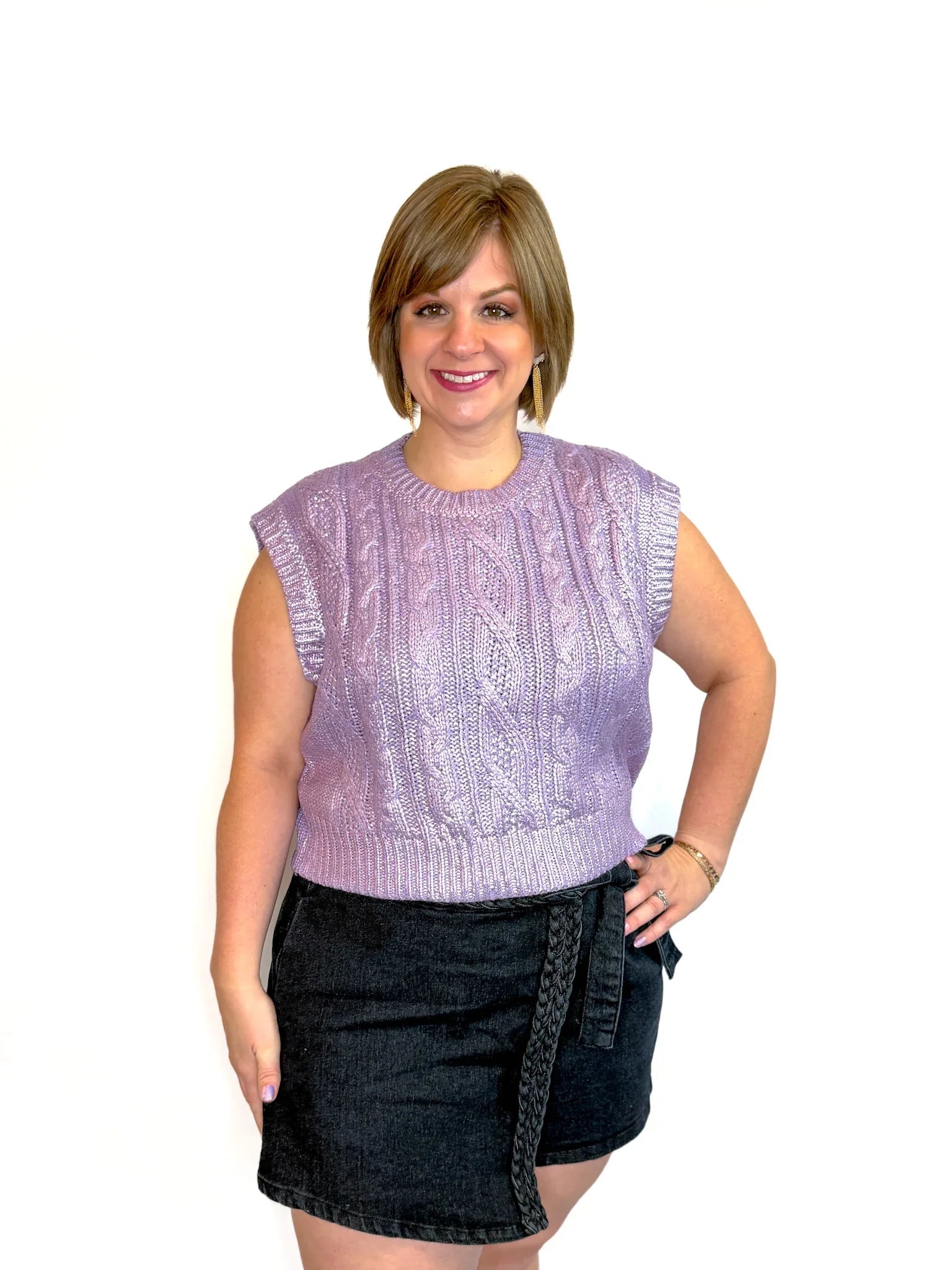Shine bright in this stunning lilac metallic cable knit top featuring a chic cropped silhouette and classic cap sleeves. Perfect for gameday or a night out, this eye-catching piece adds an effortless, high-end shimmer to your favorite high-waisted looks.
